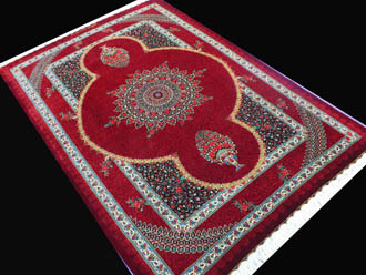 九,动物花鸟纹饰.在地毯上的动物可以是真实的,也可以是奇幻的.一些真实的贵族动物如鹿,马,豹等都常常出现在以花为背景的彼此争斗场面中,这种萨法维波斯地毯就叫做动物地毯.还有一些家养动物出现在游牧地毯中,但总是作为一种次要的,形式化的因素.真实和虚幻的动物都出现在动物斗争的场景中.不论在地球上还是在宇宙中,这些斗争代表了正义与邪恶之间不可避免的战争,因此这也就象征了生物的平衡.这种图案来源于中国,是在14到15世纪传播到中亚去的.还有两种奇幻动物也是来自中国的,那就是象征着无限权威的龙,和象征着不朽的凤凰.当配成队的时候,它们就代表了婚姻的联合,然而它们互相战斗时,它们就暗指宇宙的平衡与和谐.那些虚幻的动物在大约14-15世纪向西传播,它给地毯工匠以灵感,促成了高加索地区龙毯的产生.